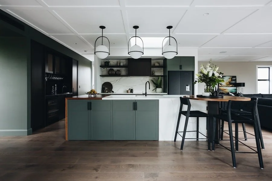 Inside, use of natural materials adds to a comfortably rustic vibe. Floors are wooden oak veneer in living areas or fitted with pure wool Bremworth carpet in the bedrooms. The indoor/outdoor room features tiles imported from Italy and a high ceiling clad in dark wood. The colour scheme is a gentle interplay of light and dark, neutral-coloured walls contrasting with dark wood and moodier tones such as the sage green of the entrance hall and kitchen.